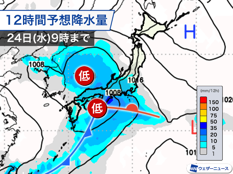 また、低気圧が発達すると雨だけではなく風も強まり、荒れた天気となる可能性があります。西日本や東日本は24日(水)、北日本は25日(木)に大きく天気が崩れるとみられますので、注意が必要です。