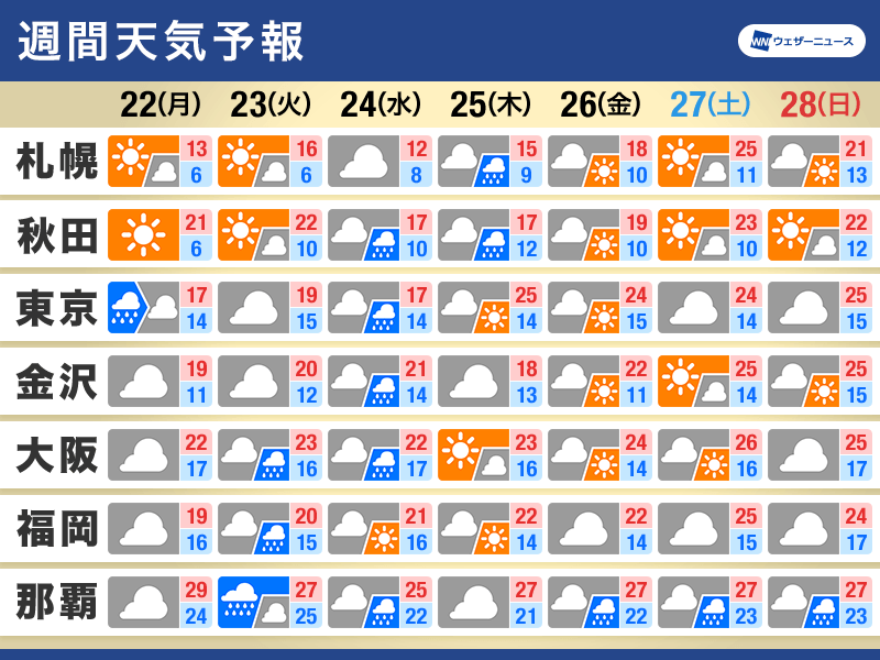 また、低気圧が発達すると雨だけではなく風も強まり、荒れた天気となる可能性があります。西日本や東日本は24日(水)、北日本は25日(木)に大きく天気が崩れるとみられますので、注意が必要です。