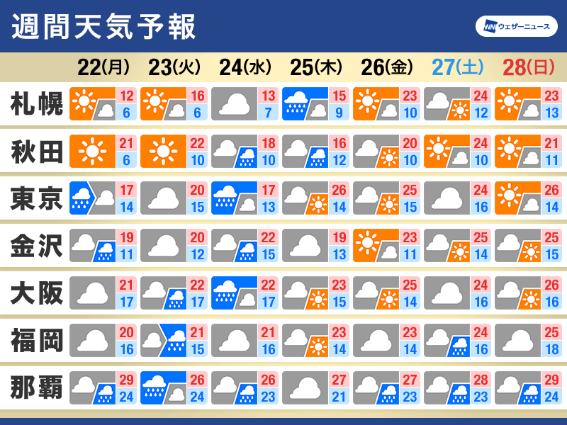 25日(木)からは前線が南に離れ、移動性高気圧が張り出してくるため西日本から関東は晴れるところが多くなりそうです。