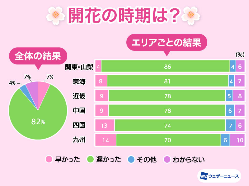 今年の東日本、西日本の桜開花 8割以上が遅かったと体感