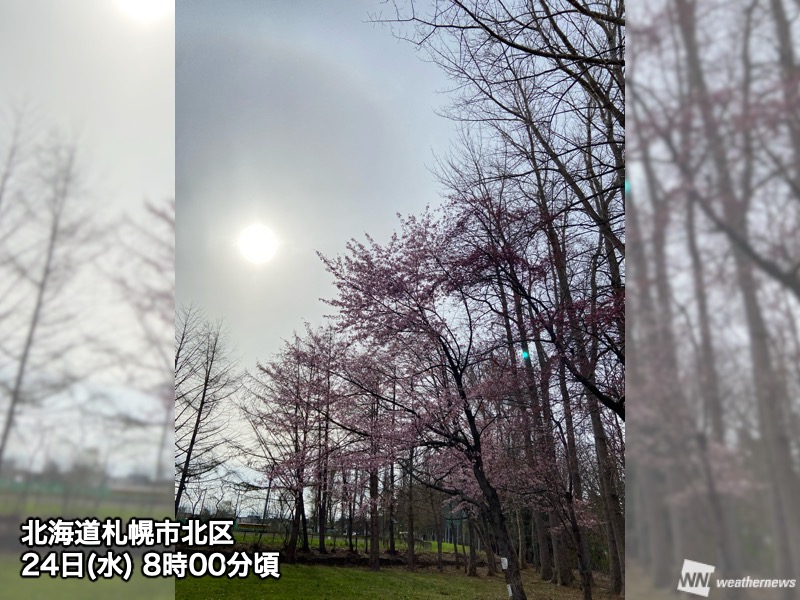 今日は日本海にある低気圧から、天気図には描かれない前線がのびています。この前線に伴う薄い雲が北海道にかかり、ハロが出現しました。札幌では今月18日に桜が開花していて、道内では満開になっている所もあります。桜とハロの美しいコラボレーションが見られました。