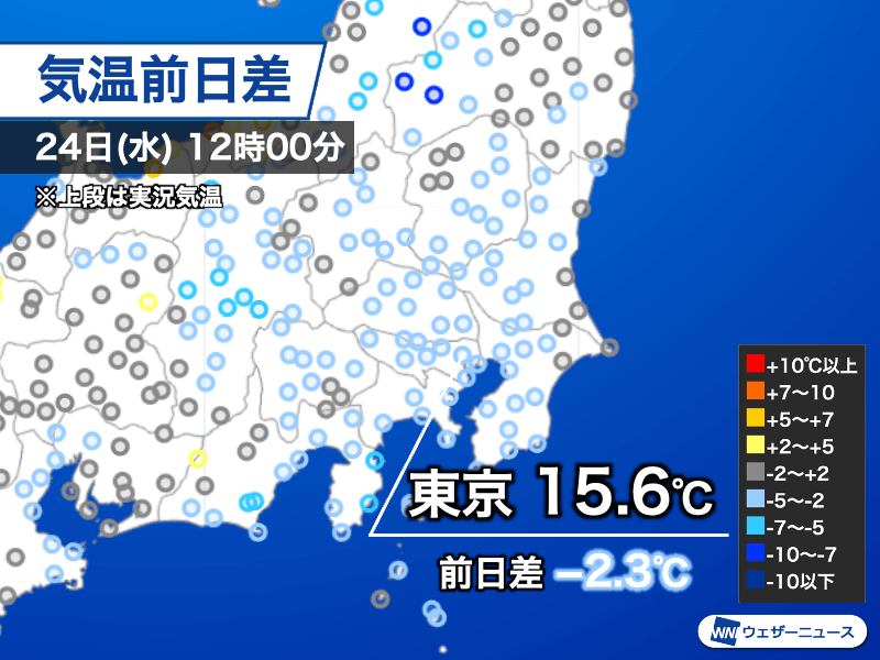 前線や低気圧が本州の南岸を通過している影響で、関東では朝から雨が降ったり止んだりになっています。東京都心の気温は、今朝6時00分が14.6℃、12時00分が15.6℃と、6時間で1℃しか上がっていません。昨日の12時と比べると、2.3℃低い状況です。