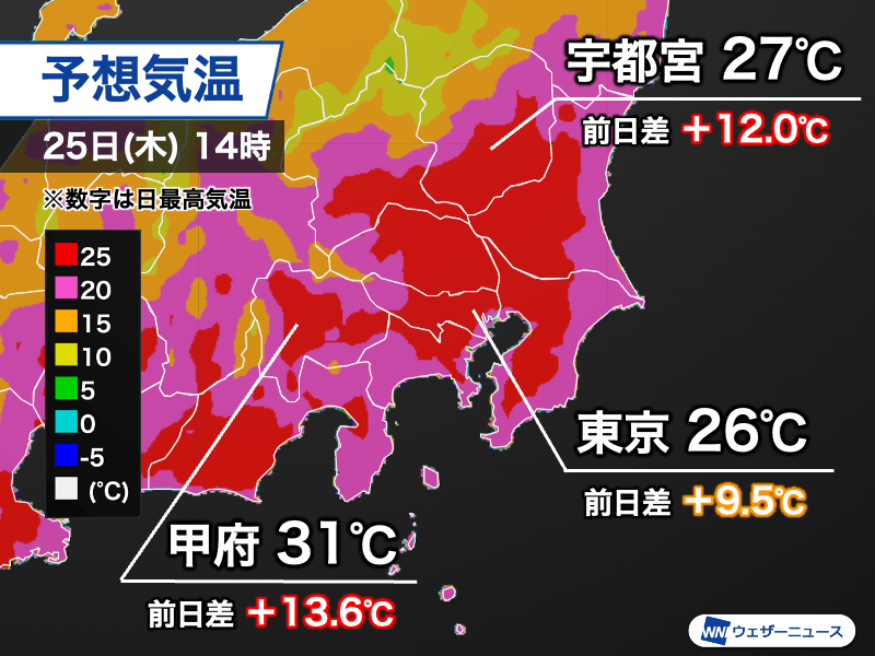 明日25日(木)の関東など東日本太平洋側は気温が大幅に上がり、25℃を超える所が多い見込みです。甲府ではさらに高く、今年初めて30℃以上の真夏日になる可能性があります。こまめな水分補給など熱中症対策が欠かせません。