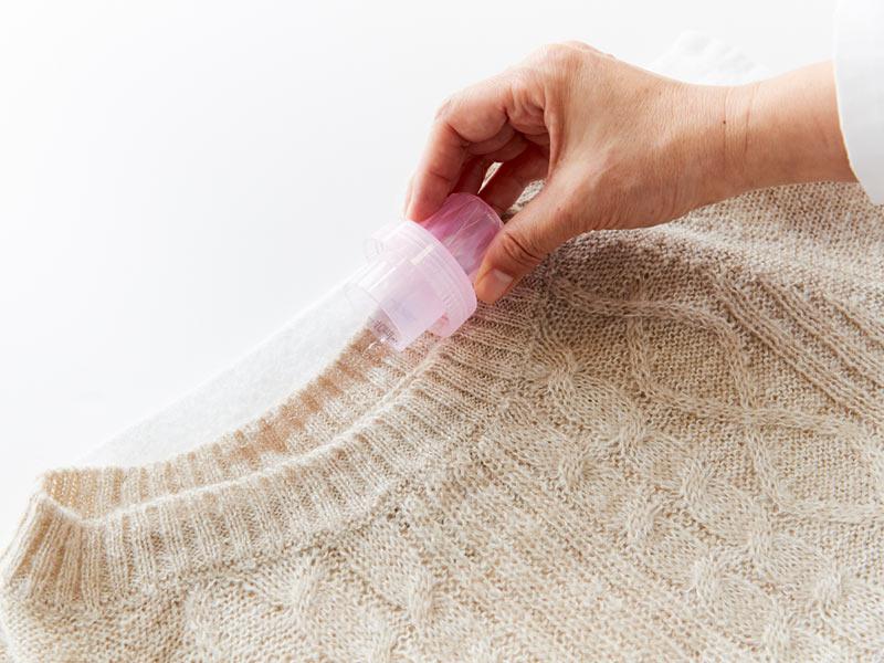 えり、袖口、脇の下、口紅・ファンデーションなどの化粧品汚れなど気になる汚れにおしゃれ着用洗剤の原液をつける。キャップの底でたたき、洗剤を生地になじませる。