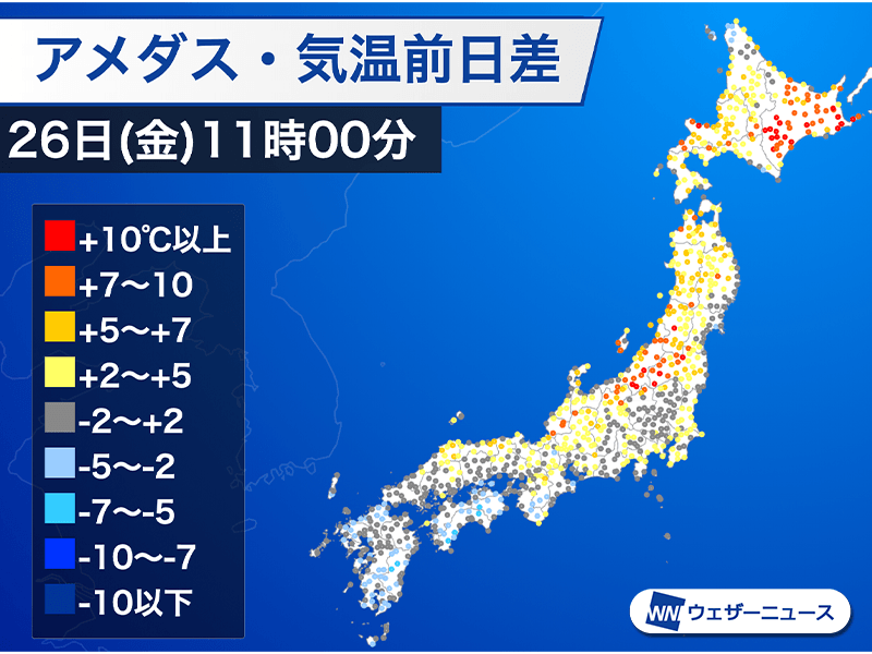 今日26日(金)11時の気温は、札幌で昨日の同じ時刻より4.9℃高い18.3℃でした。また、帯広で10.1℃高い21.4℃、青森で5.0℃高い21.7℃、秋田では6.3℃高い20.2℃です。
