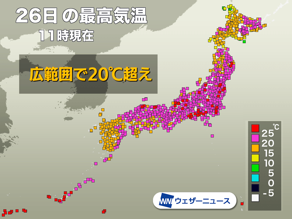 西から雲が広がってきた関東から九州も引き続き気温は高めです。11時の気温は東京で昨日より0.6℃高い24.4℃、大阪で1.4℃高い22.4℃、福岡では2.6℃低い18.3℃でした。各地とも昨日と同じくらいの暖かさになっています。