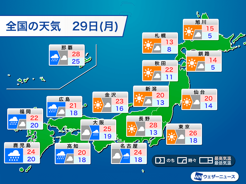 明日29日(日)・昭和の日は西から天気が下り坂で、次第に雨の範囲が広がります。雨の降り出しが早い九州や中国、四国は気温があまり上がりません。最高気温は福岡市で22℃、広島市で21℃の予想。大阪市や名古屋市も今日よりは低く、暑さは落ち着く見込みです。