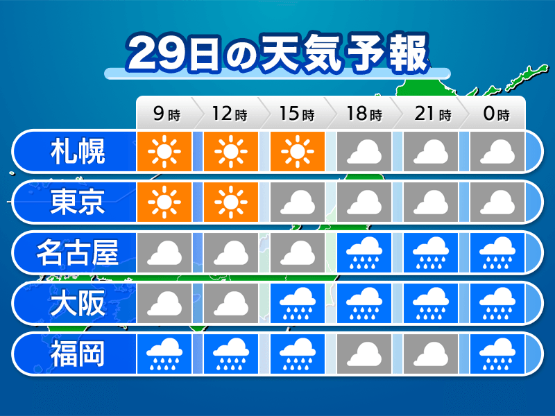中国・四国地方では午前中から、近畿では午後から雨の所が多くなり、夕方には東海や北陸でも雨が降りだす見通しです。お出かけの方もお仕事の方も、午後の雨に備えて傘を持っておいたほうが良さそうです。