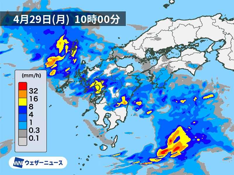 今朝も活発な雨雲が九州の西や四国の南に点在していて、海上を中心に雨が強まっています。発達した雨雲が陸地を通過するタイミングでは1時間に30mm以上の激しい雨の降る可能性があります。落雷や突風を伴うおそれもあるため注意してください。