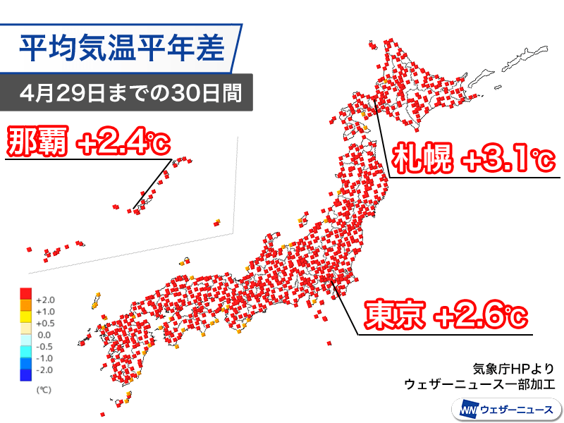 全国ほぼ全ての観測地点で平年より2℃以上高い