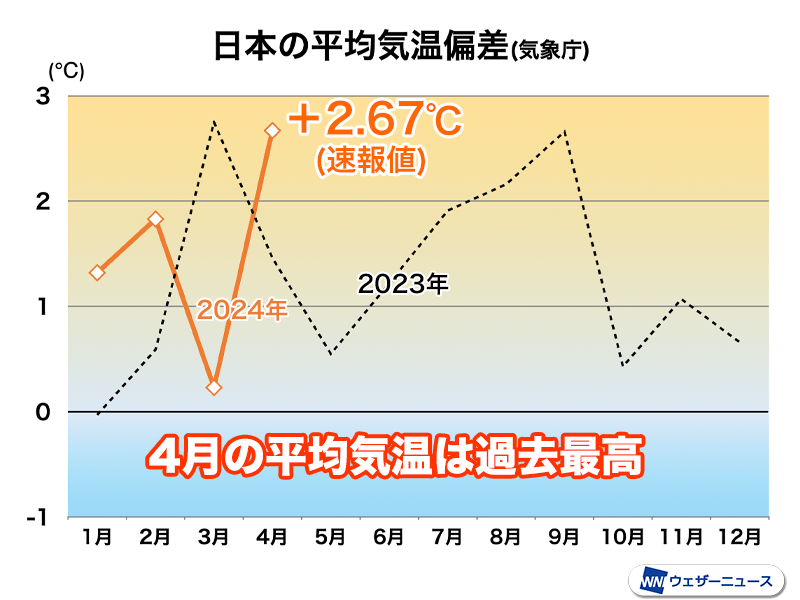 平年に近づいた3月とは一変して、これまでの4月の最高だった1998年の+1.97℃を大きく上回っています。これで昨年の2月以降、15か月連続で平年よりも高い気温となりました。