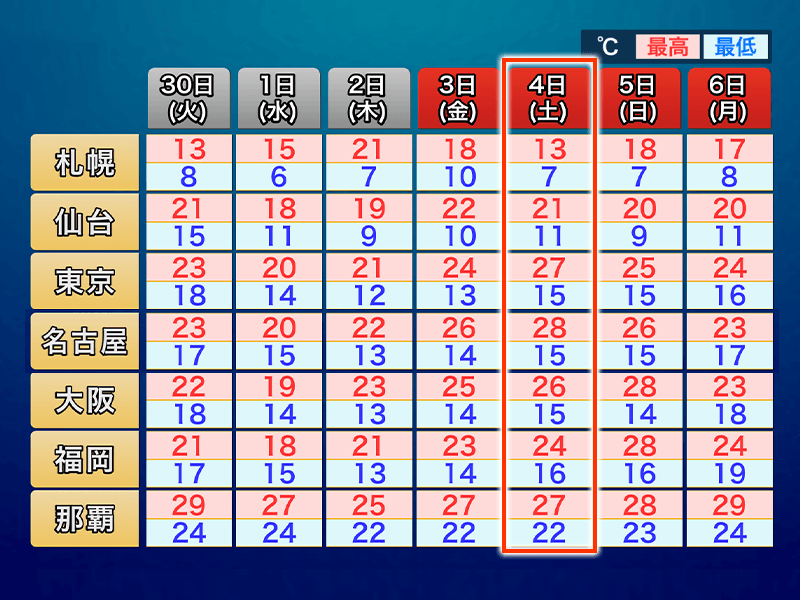 北海道は気温変化が大きく、札幌市は3日(金)の18℃に対し4日(土)は13℃の予想となっています。道北では最高気温が10℃に届かない所もある見通しです。