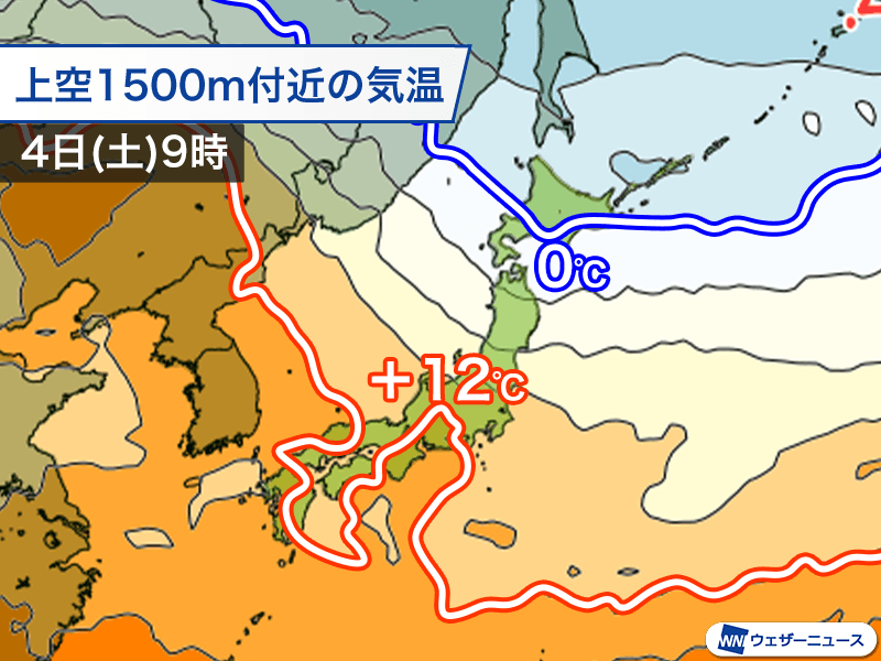 4日(土)の上空1500m付近の気温分布を見ると、+12℃以上の初夏の空気が西日本から東海付近まで覆うのに対し、北海道付近は0℃以下の春のはじめ頃の空気に覆われます。10℃以上にも達する上空の気温差が、そのまま地上の気温に反映される見通しです。