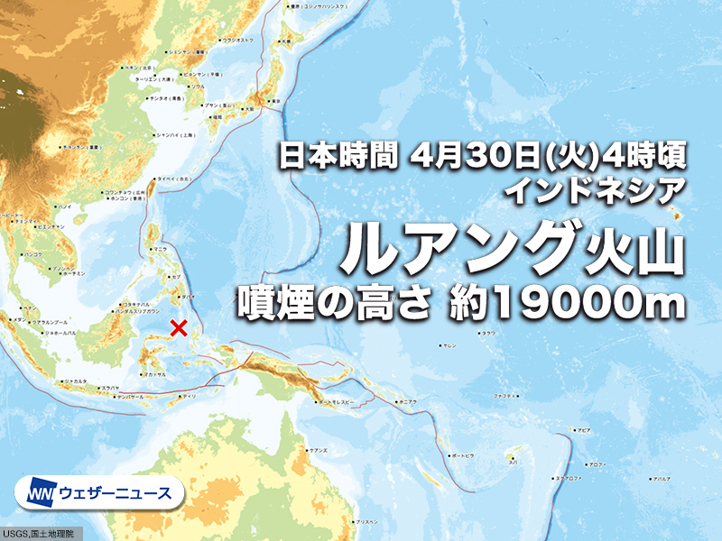 日本時間の今日4月30日(火)4時頃、インドネシア・北スラウェシ州にあるルアング火山で大規模な噴火が発生しました。