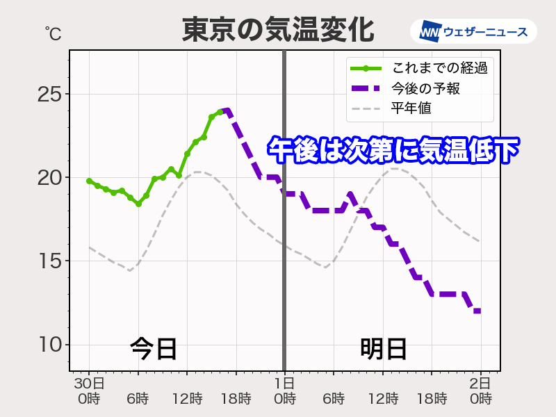 雨が本格的に降り出す昼前から気温は下がりはじめ、午後は時間とともに気温が低下する予想となっています。夕方の帰宅時間帯は13℃くらいで朝よりも5℃ほど低くなる見込みです。