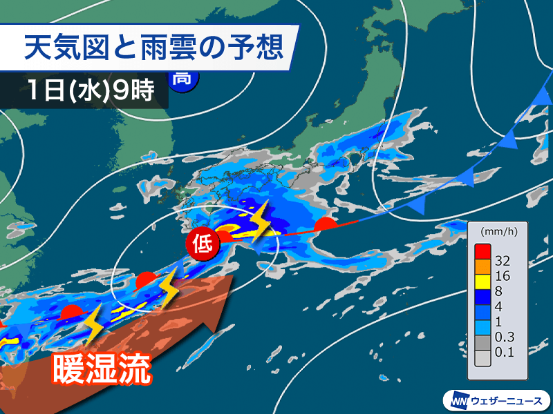 雨の予想 1日(水)9時