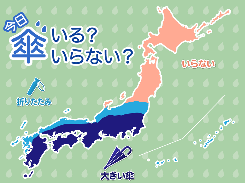 沖縄は変わりやすい天気で、急な強い雷雨に注意が必要です。山陰や北陸、福島県は夕方にかけてパラパラと雨の降る可能性があります。外出には折りたたみ傘をお持ちください。