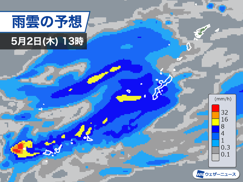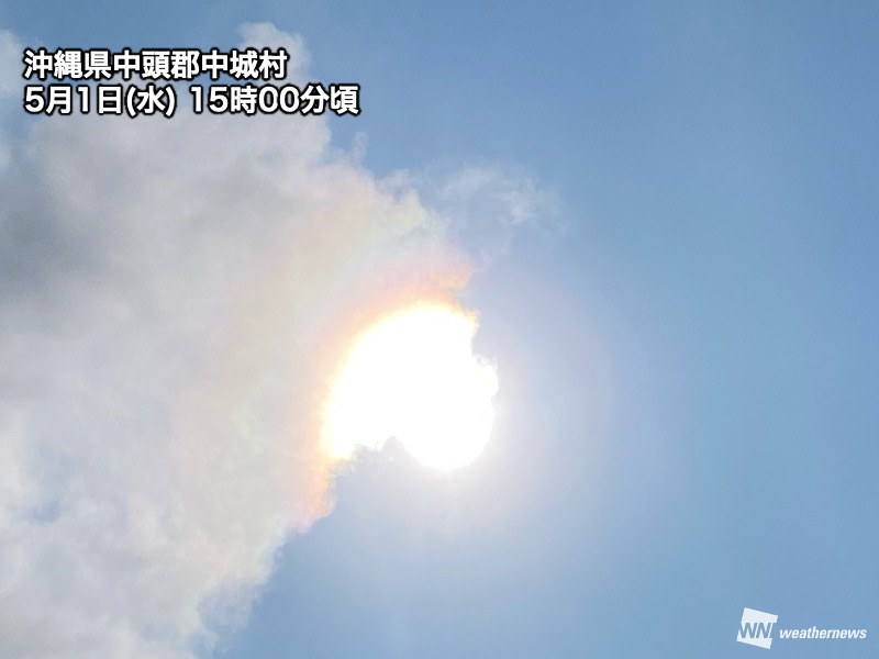 今日5月1日(水)の午前中は前線に伴う活発な雨雲が通過して、那覇などで1時間に20mmを超える強い雨を観測しました。15時30分現在は前線の南下に伴い、活発な雨雲は海上に離れています。雲が多いながら日差しが届き、彩雲やハロ(日暈)などの光学現象が見られている所もある状況です。