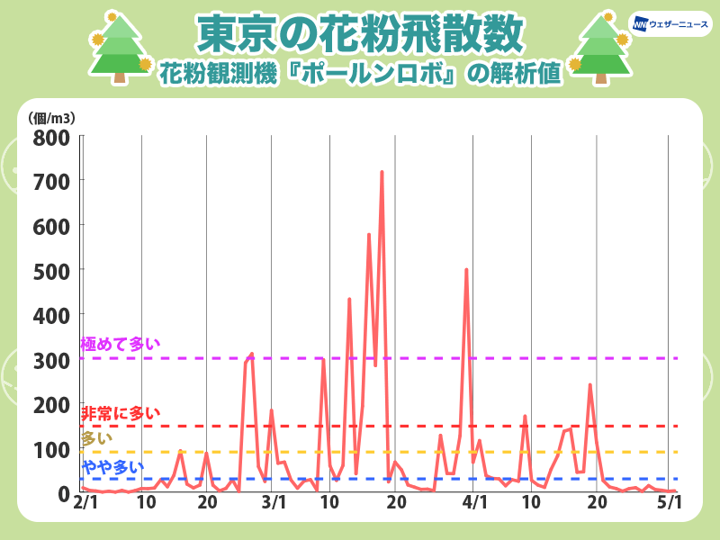 東京では2月中旬にスギ花粉のシーズンに入り、特に2月下旬から3月中旬にかけて気温の上昇や強風によって大量飛散する日がありました。
