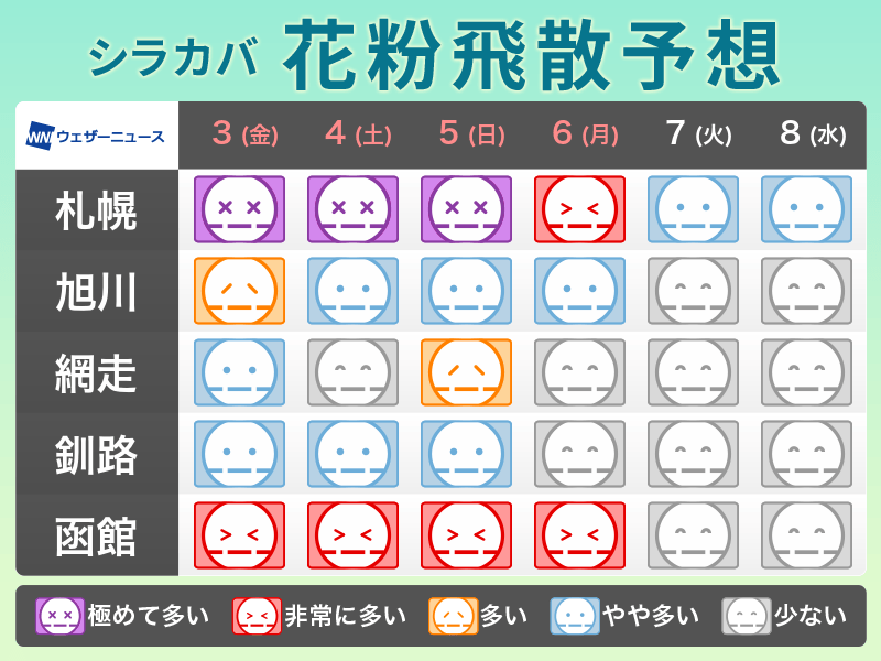 九州から東北のスギ花粉・ヒノキ花粉が落ち着く一方で、北海道ではシラカバ花粉の飛散が本格化しています。晴れて風の強い日には大量の花粉が飛散するおそれがあるので、症状を覚える場合はマスクや目薬など万全の対策が欠かせません。