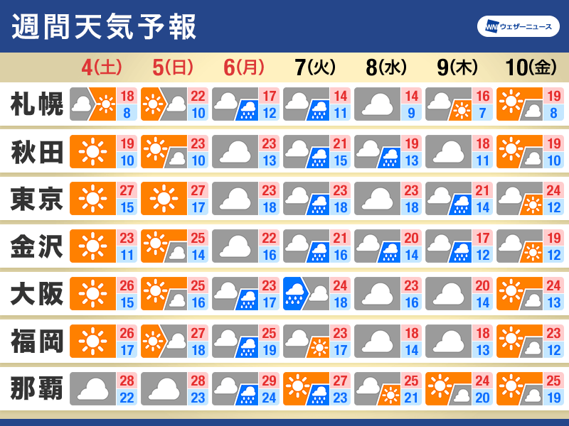 ゴールデンウィーク最終日の6日(月)振替休日から連休明けの7日(火)にかけて、低気圧や前線が日本列島付近を通過します。西から天気は下り坂となり、九州など早いところでは6日(月)朝から雨が降り出し、7日(火)にかけて雨の範囲は北日本まで広がる見通しです。雨や風が強まる可能性もあるため、最新の情報を確認するようにしてください。