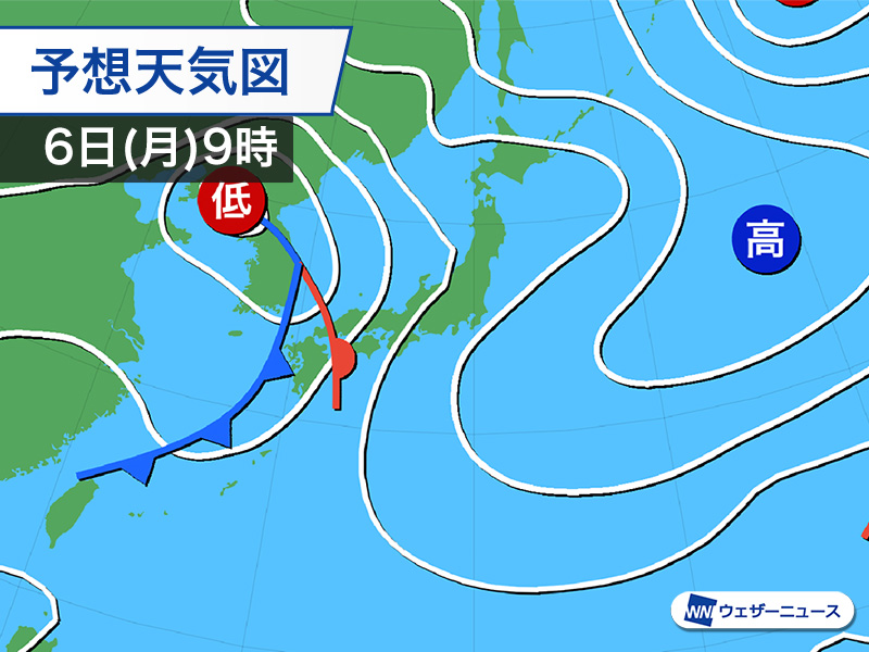 大型連休の最終日となる6日(月)は低気圧や前線の影響で次第に雨の範囲が広がり、西日本では強い雨の可能性があります。お出かけになる場合は十分に注意が必要です。