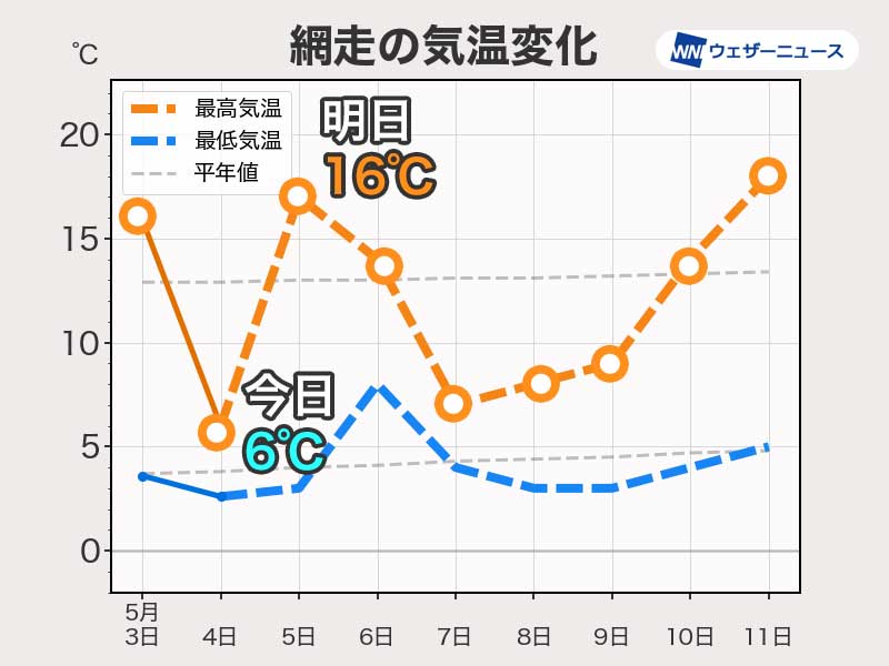 オホーツク海の低気圧の影響で海から冷たい北風が吹き付けて4月上旬並みの気温となります。例年この時期のオホーツク海側は風向きによって気温が変わりやすく、乱高下することも。これはこの地域では季節の変わり目の風物詩と言っても良いかもしれません。