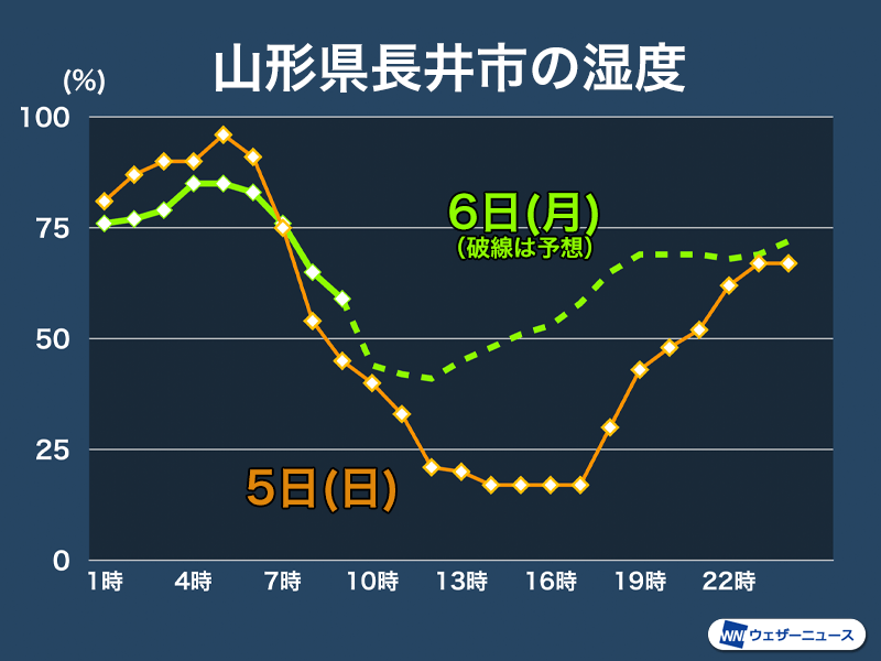南陽市に隣接する長井市のアメダス観測点では昨日まで3日連続で最小湿度が10%台まで低下し、非常に空気が乾燥していました。今日6日(月)は前線の接近に伴って雲が広がり、9時00分の湿度は60%と昨日の同じ時間帯に比べると幾分高めです。