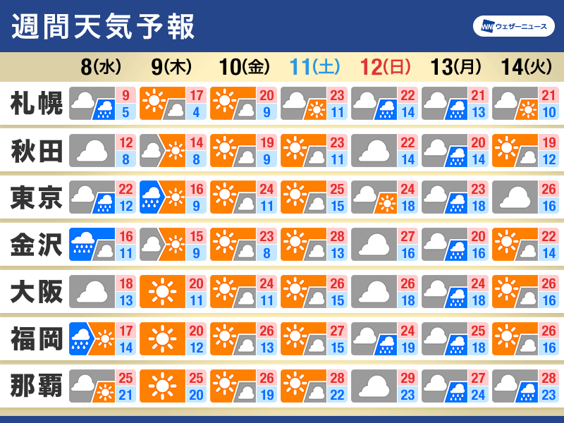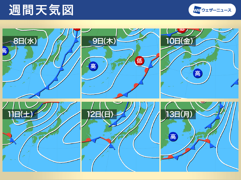 明後日9日(木)にかけて広い範囲で大気の状態が不安定となりますので、天気の急変に注意が必要です。週の後半は高気圧に覆われて全国的に晴れる日があるものの、週末12日(日)以降は再び前線の影響で天気は下り坂に向かいます。