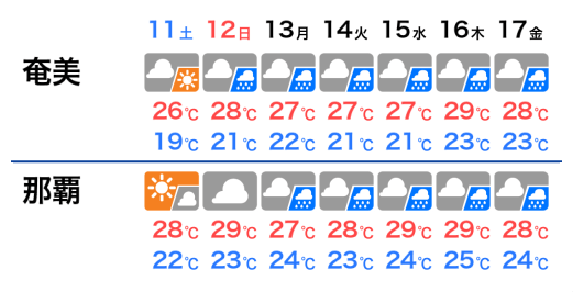 天気下り坂へ向かう12日(日)以降、南西諸島では前線により雨が降りやすくなります。このため、奄美や沖縄では梅雨入りする可能性があります。