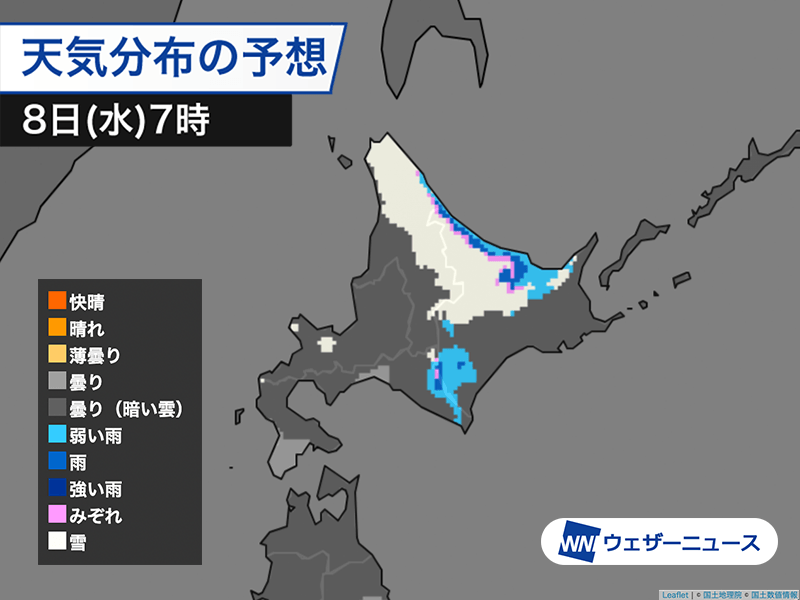 今夜から明日8日(水)にかけ、オホーツク海側では平地でも雪の降る所があります。峠道などでは積雪や凍結のおそれがあり、車の運転は注意が必要です。