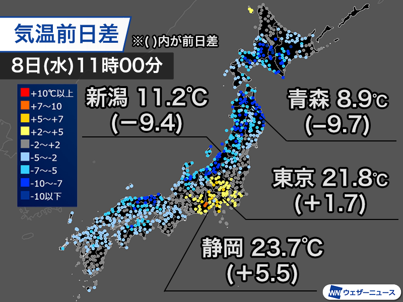 11時時点の青森の気温は8.9℃、3月下旬並みで昨日から9.7℃低い気温です。新潟の11.2℃(前日差−9.4℃)、岩手県宮古の9.9℃(前日差−11.8℃)など北日本や北陸、近畿北部を中心に昨日からの気温低下が顕著になっています。