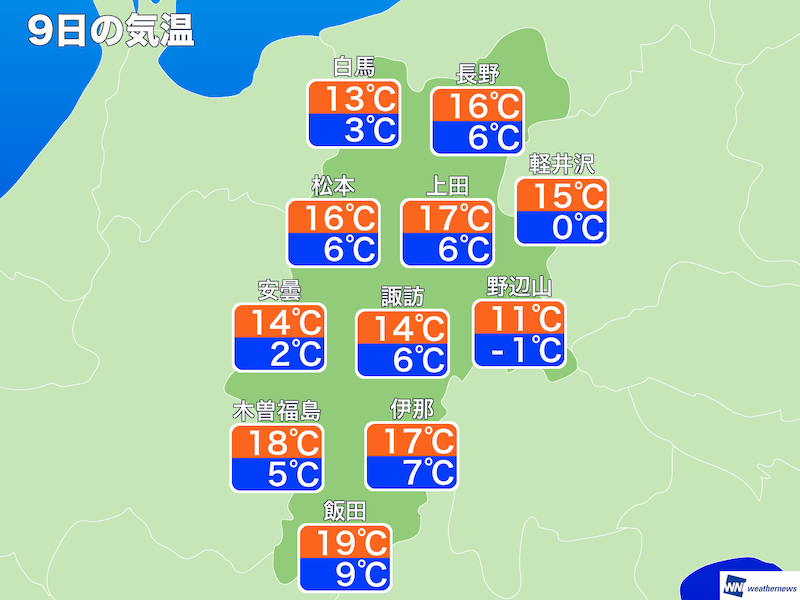 長野県の9日(木)予想気温