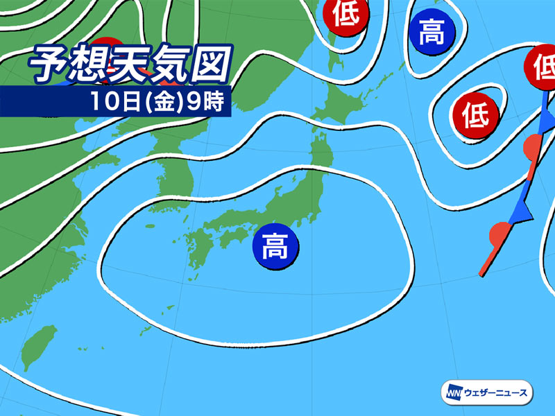 明日10日(金)は東に進む移動性の高気圧が日本列島を覆って広く晴天となります。洗濯物の外干しも捗りそうです。