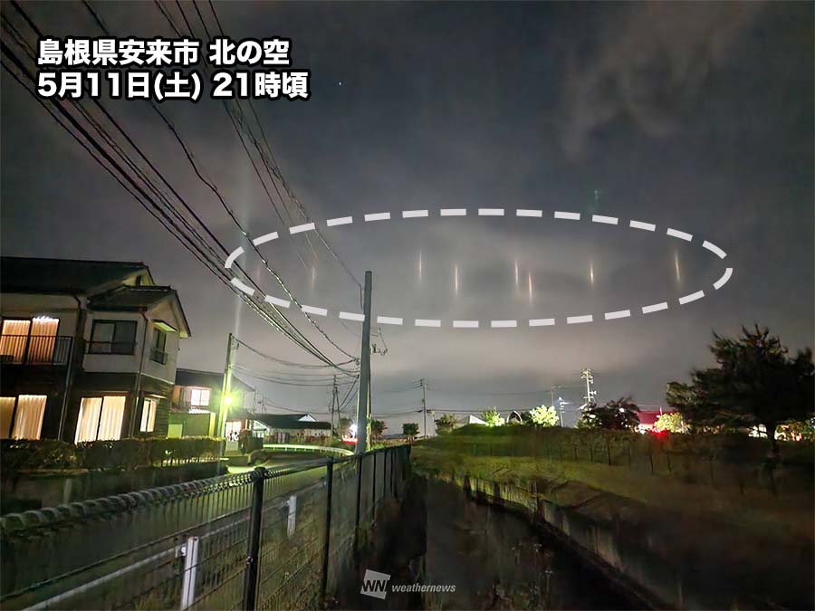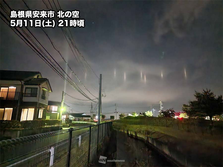 11日(土)夜は、島根県安来市のウェザーニュースアプリユーザーから光柱の写真が投稿されました。このほかSNSでは鳥取県からも光柱の写真が投稿され、低緯度オーロラの話題の背後でひそかな話題となりました。