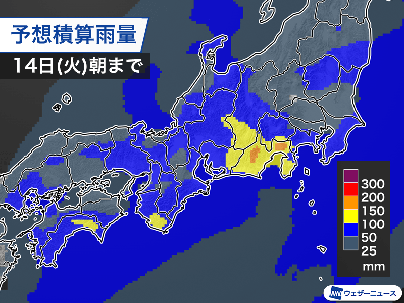 東海では昼過ぎまで、関東や東北では夕方まで断続的に雨が降る予想となっています。東海では総雨量が多くなる所があり、静岡県の多い所では150〜200mmに達する見込みです。