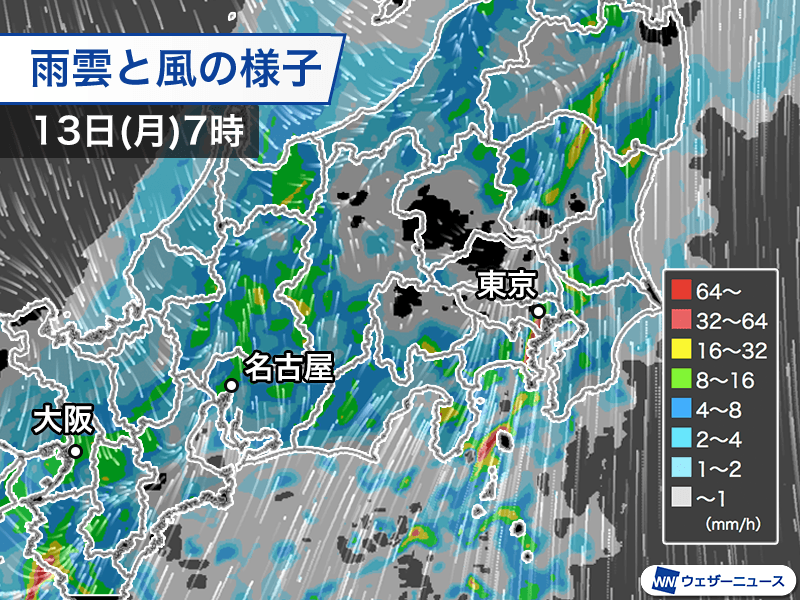 今日12日(日)は活発な前線の通過に伴い西日本で雨で雨が強まっています。明日13日(月)は東日本、北日本に活発な雨雲が移動し、朝の通勤・通学時間帯は関東や東海などで荒天に警戒が必要です。