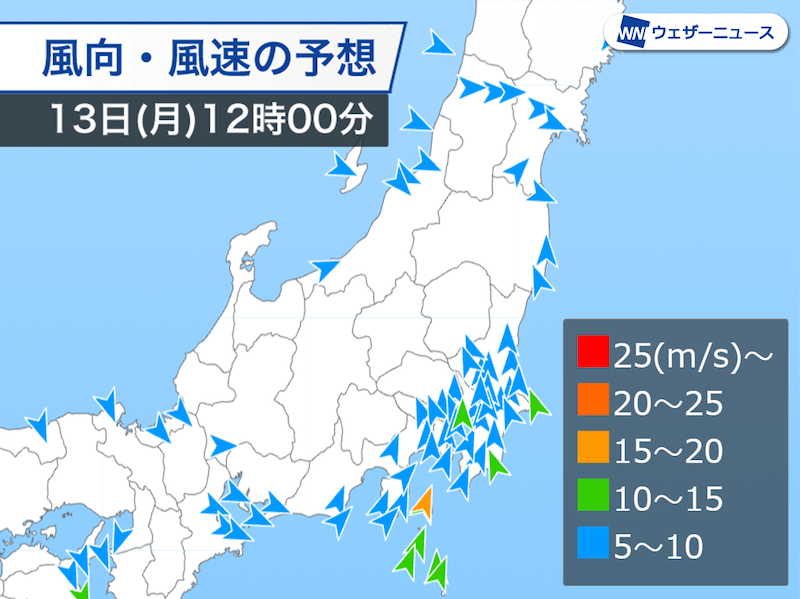このあと関東を前線が通過します。このため、夕方にかけて南よりの風の強まりやすい状況が続く見込みです。沿岸部を中心に横殴りの強雨となるおそれがありますので、外出は大きめの丈夫な傘をお持ちください。