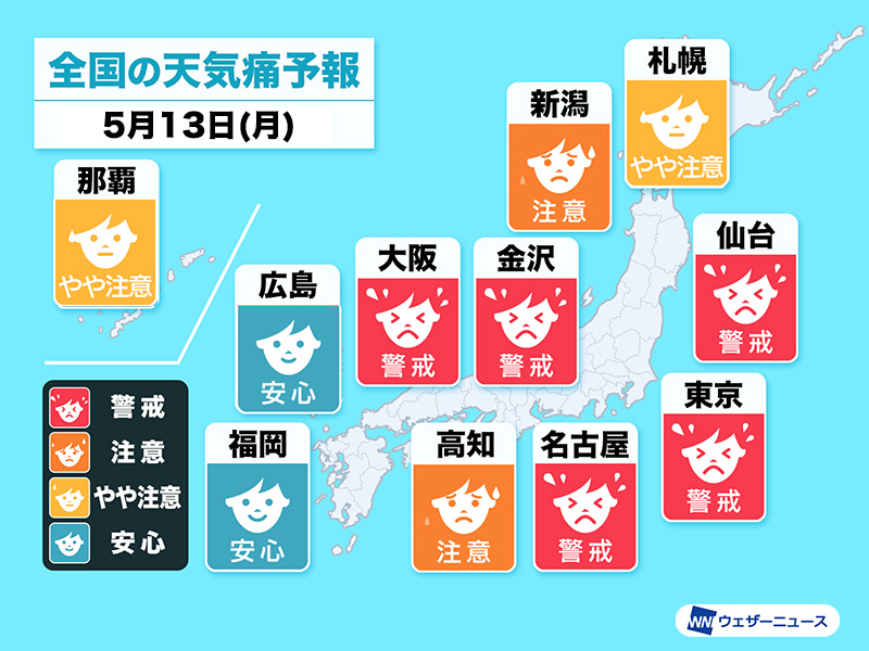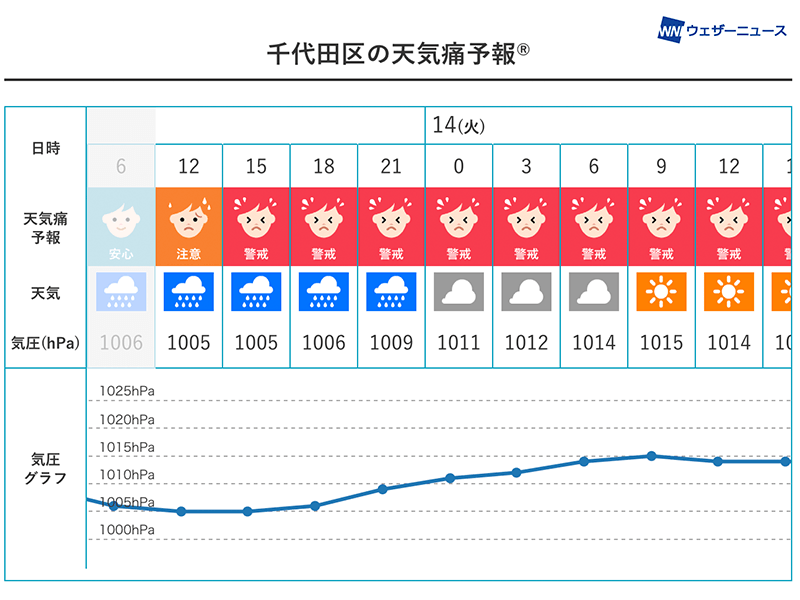 このように、短期間で大きく気圧が変化する影響で、個人差はあるものの頭痛や関節痛などの天気痛の症状がでる可能性があります。