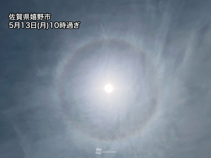 九州は前線に伴う厚い雲が抜けて日差しが戻り、上空の高い所に薄い雲が残ったことで、太陽の周辺にはハロが現れています。
