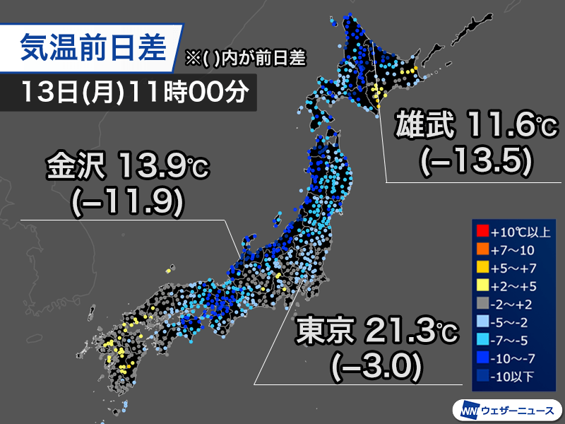 特に昨日は南寄りの風によってフェーン現象が発生した北陸、北海道のオホーツク海側は、北寄りの風に変わったことで気温が大幅にダウンしました。11時00分の気温は金沢市で昨日の同じ時刻より11.9℃低い13.9℃、北海道雄武町は13.5℃低い11.6℃です。