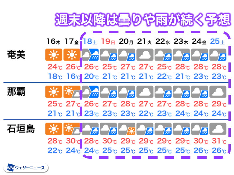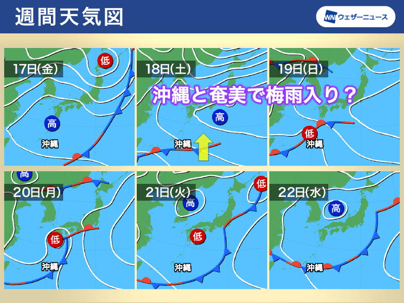 週末以降は前線や湿った空気の影響で、沖縄や奄美では曇りや雨の日が続く予想です。このタイミングで梅雨入りする可能性が高いとみられます。