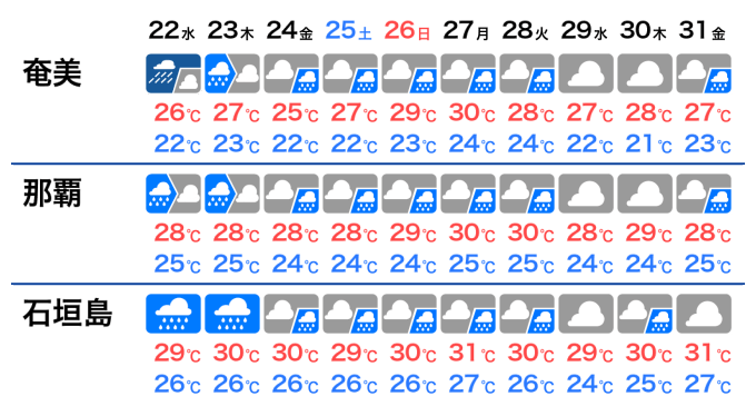 日差しは乏しくとも気温は平年並みかやや高めで、湿度も高く不快な蒸し暑さとなりそうです。石垣島など先島諸島では熱帯夜となる日も出てきます。