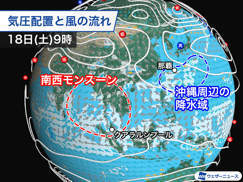 明日18日(土)の風の流れの予測を見ると、インド洋では西〜南西の風が卓越して東南アジアに吹き込む状況となり、南シナ海でも南寄りの風が目立つ状況です。南西モンスーンによって日本付近では次第に梅雨前線が明瞭になっていきます。明日は沖縄付近に降水域が予想されていて、梅雨入りが発表されるかもしれません。
