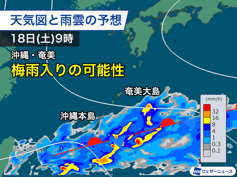 明後日19日(日)以降も前線が停滞して曇りや雨の日が続く見通しで、このタイミングで梅雨入りが発表される可能性が高まってきました。沖縄の梅雨入りの平年日は5月10日頃ですので、平年よりは少し遅い本格的な雨のシーズンとなる見通しです。