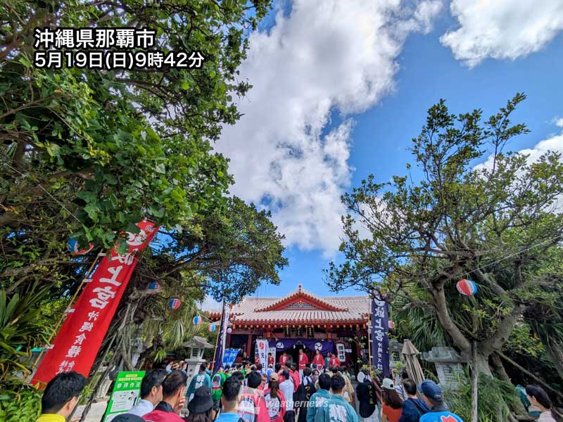 今日19日(日)の沖縄はやや雲が多いものの、強い日差しが照り付けて初夏らしい陽気となっています。