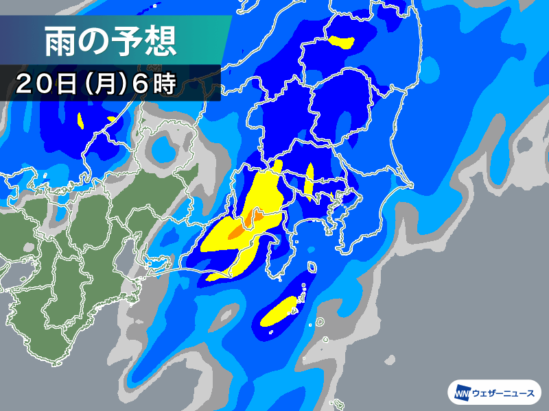 明日20日(月)朝の出勤時は本降りの雨となり、沿岸部では強風で横殴りの雨になるおそれがあります。大きめの傘でお出かけください。