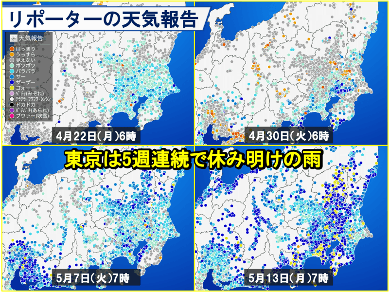 週明けの明日20日(月)も降水を観測すると実に5週連続で休み明けの朝に雨が降ることになります。