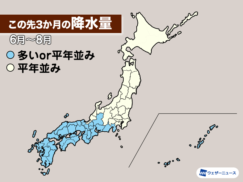 暖かく湿った空気は、西日本や沖縄・奄美を中心に流れ込みやすいとみられます。この影響で梅雨前線の活動が活発になり、周辺では梅雨時期の降水量が多くなる見通しです。