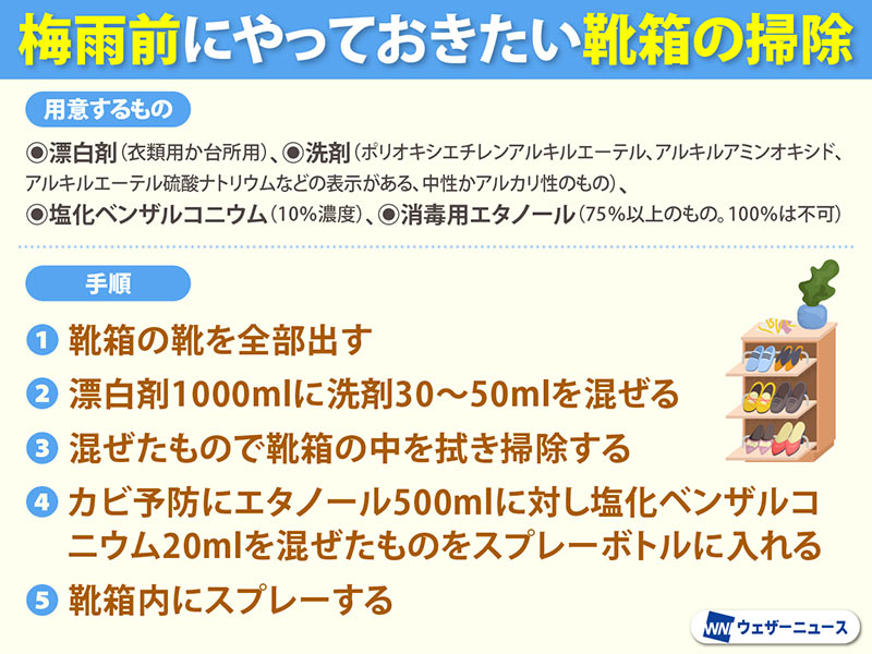 まもなく梅雨の季節が訪れます。その前に靴箱のカビ対策をしっかり済ませ、爽やかな気分でこの時季を過ごしましょう。